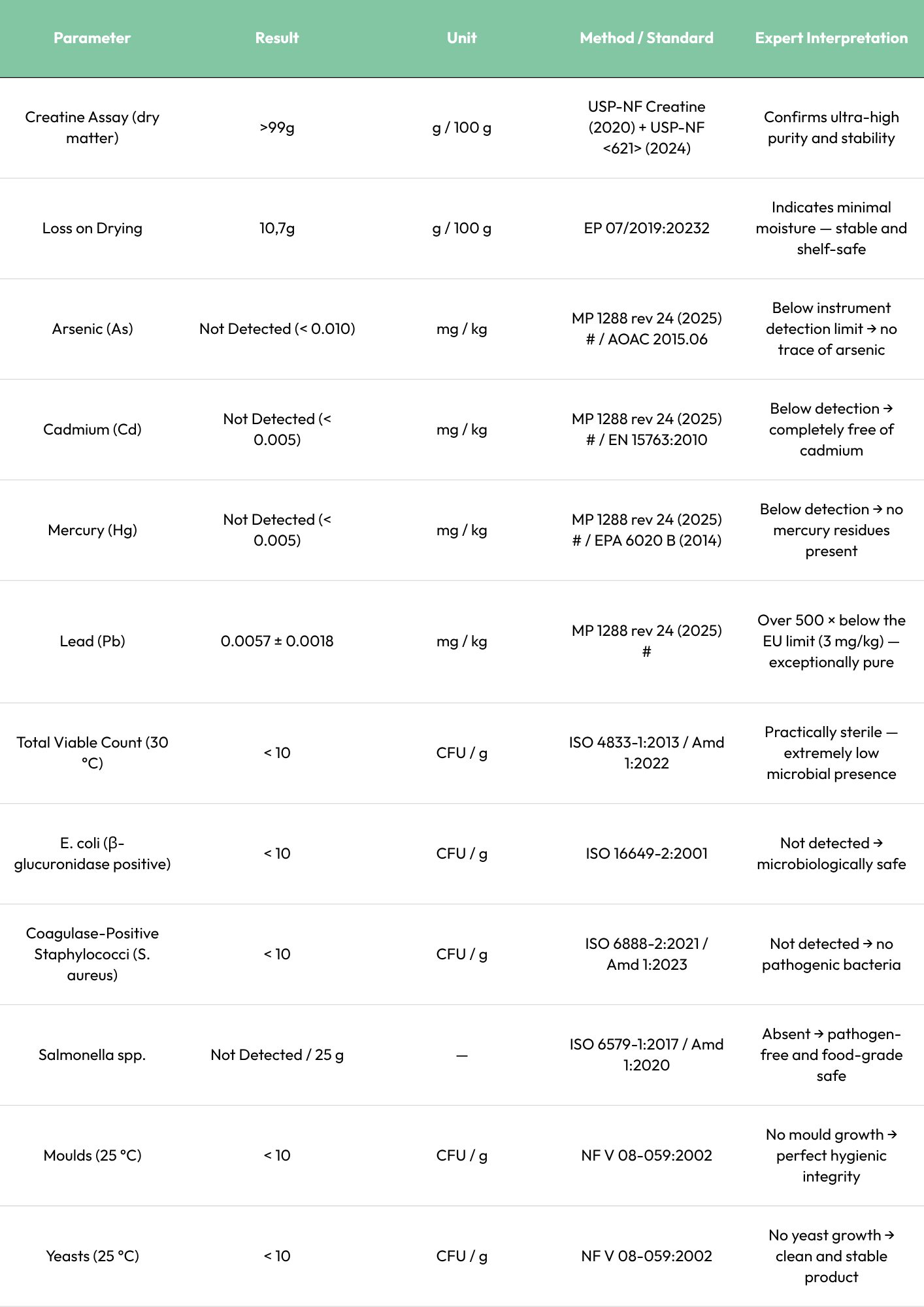 • Overall, Optimized Creatine meets pharmaceutical-grade purity criteria ( >99% assay on dry matter), with no tested contaminants detected above analytical limits and excellent microbiological safety.